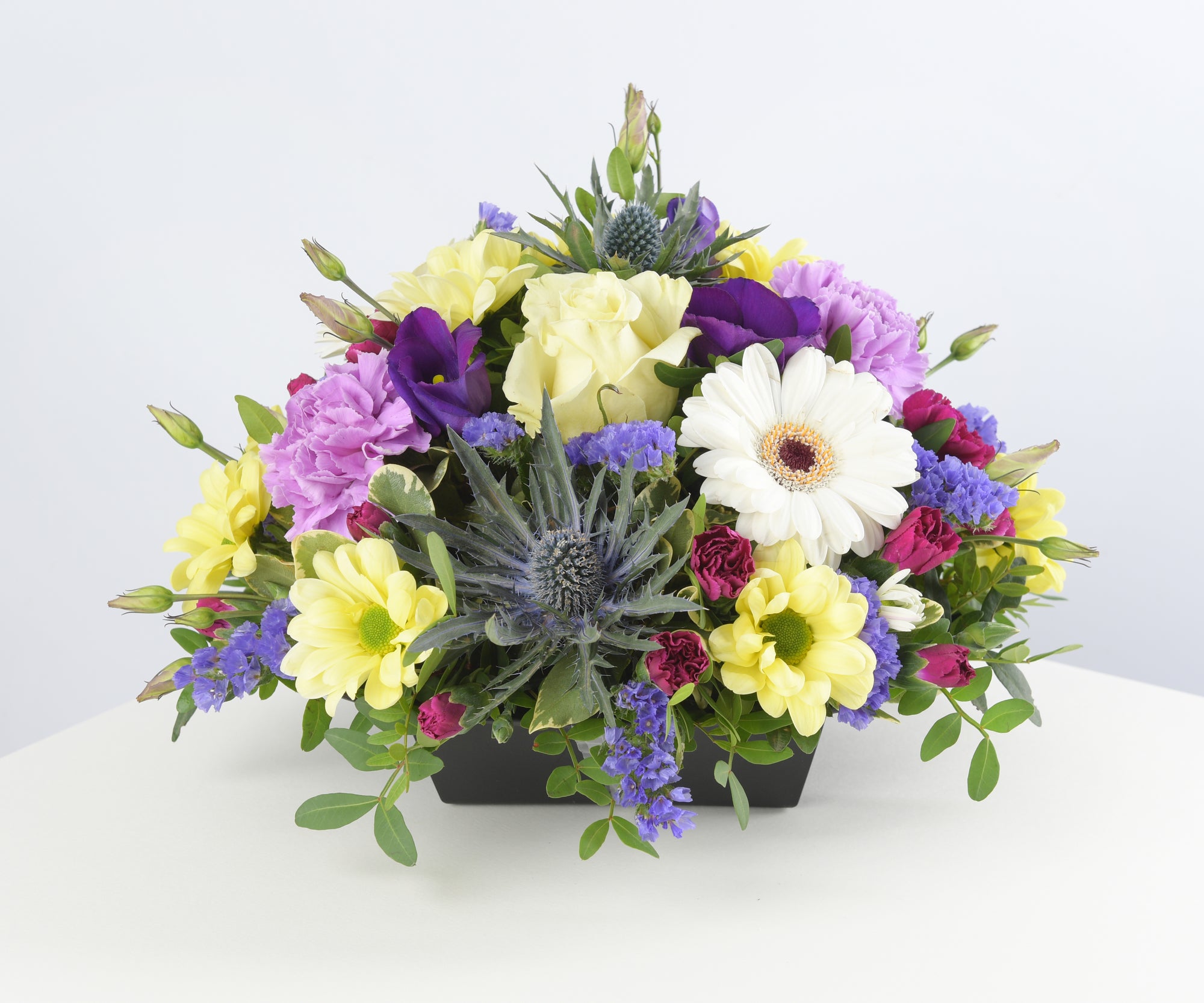 A beautiful arrangement with royal blue and deep crimson tones contrasting against beautiful creams and greens. This arrangement makes the perfect gift and will really show that special someone just how special they are.
