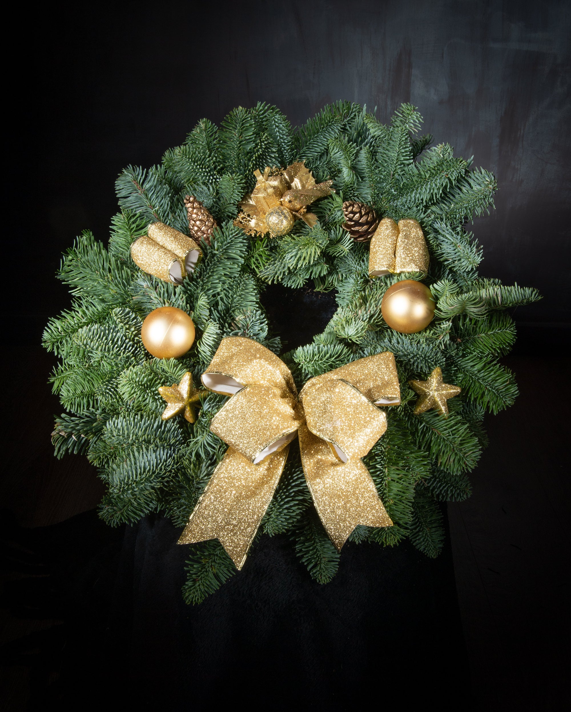 With fresh cut Noble, Christmas ribbon, Christmas baubles and pine cones.