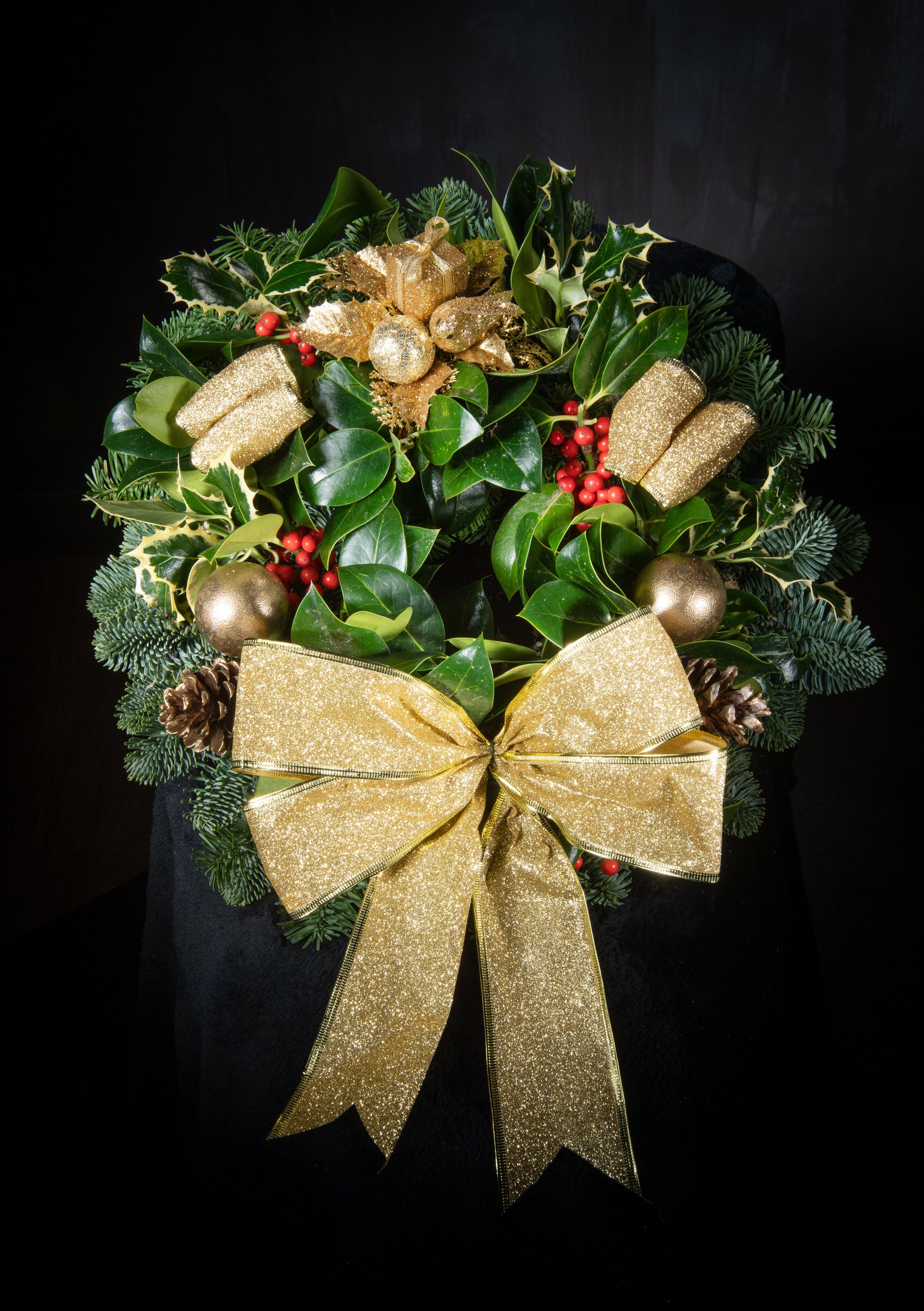 The fresh holly wreaths have a moss base using an 8 inch ring. We then gather fresh holly especially selected for wreath making which forms the holly wreath It is then decorated with a selection of Christmas ribbon, real pine and other coniferous cones, replica Christmas baubles & parcels, replica or real holly berries (depending on the season and whether the birds have got their first!