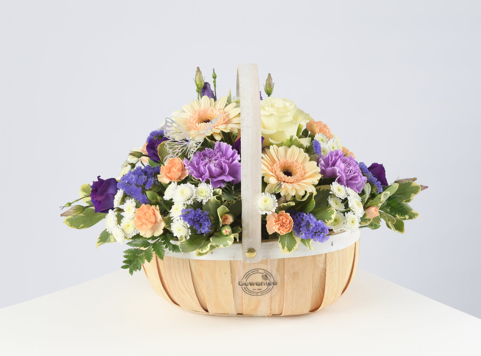 Make someone blush with this stunning and elegant floral gift basket containing timeless blooms of beauty and classy wraps of leafy green foliage. This traditional lilac and peach colour scheme will truly show how much they mean to you.