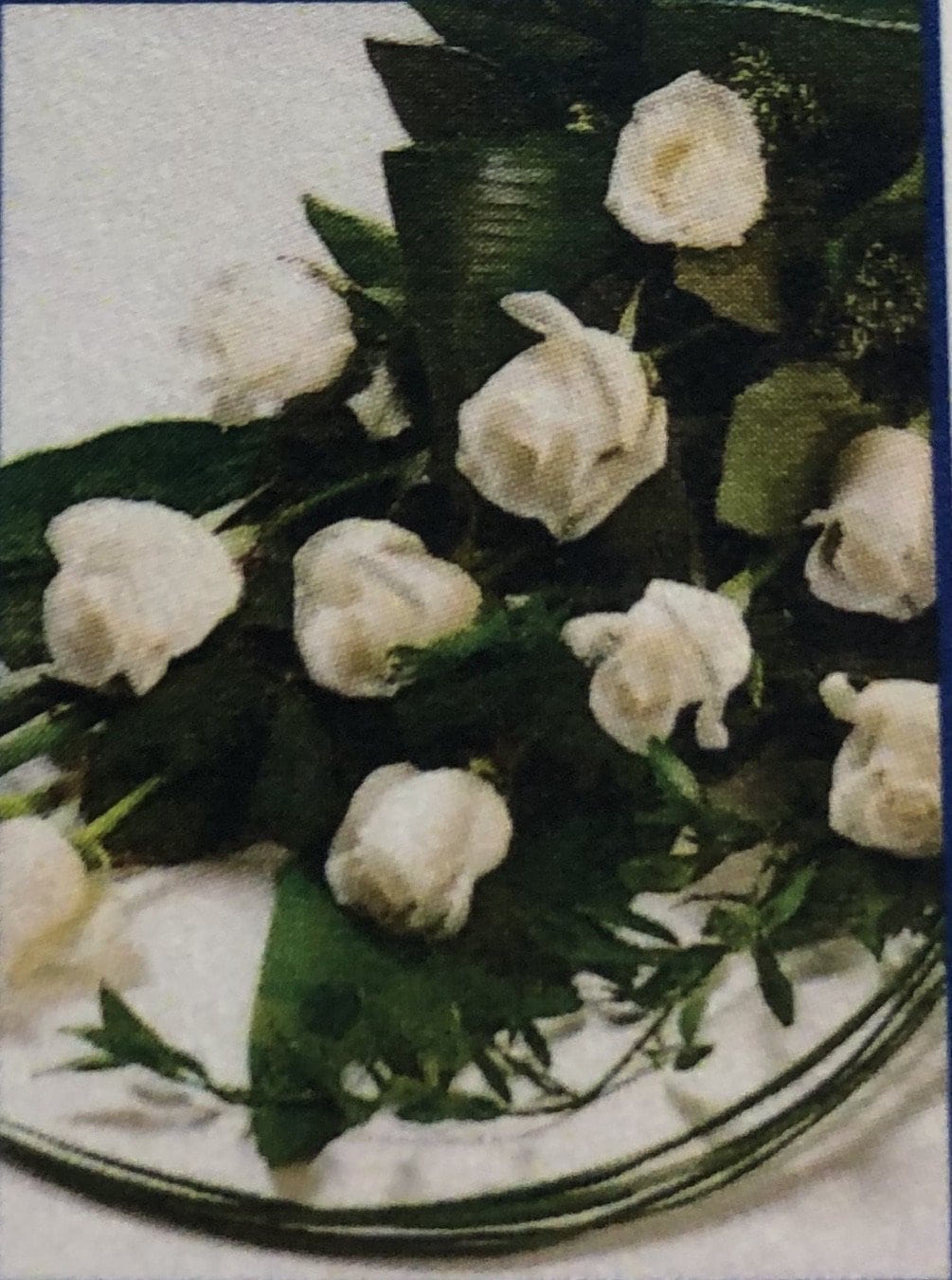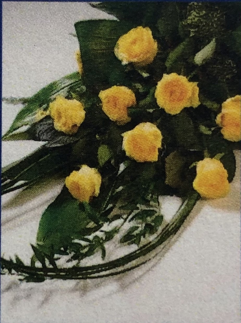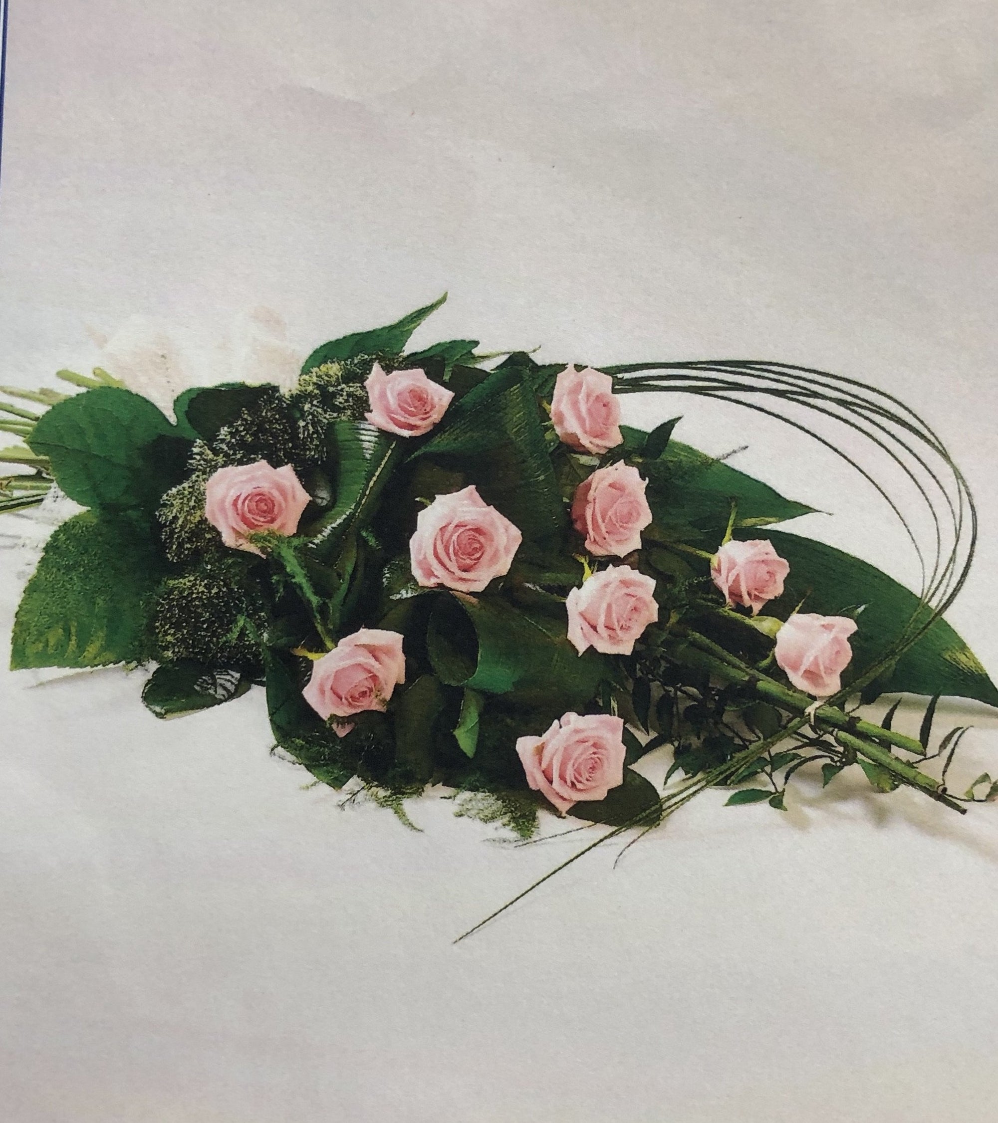 Striking Aspidistra leaves are nestled amongst large headed pink Roses to create this stunning sheaf which is finished with delicate white Trachelium and curved Steel Grass. Available in pink, yellow and white.